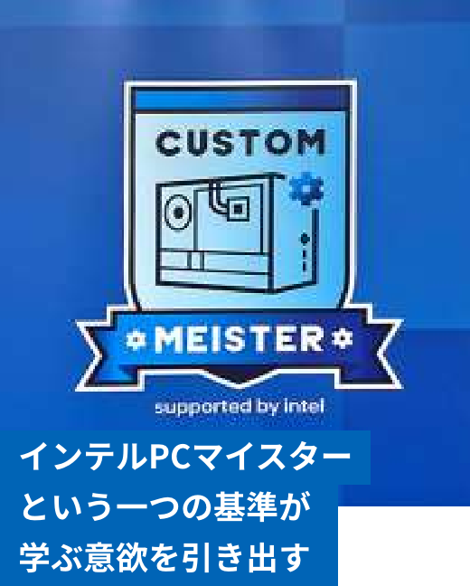 PC に関するさまざまな知識を持った「インテル PC マイスター」を認定する資格です。PC を構成するパーツの種類~特性などを理解し、個々の使用用途に合ったパーツの選定から PC の組立て、PC に関するトラブル解決の知識を持った方を認定します。